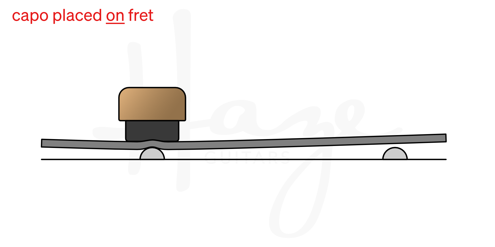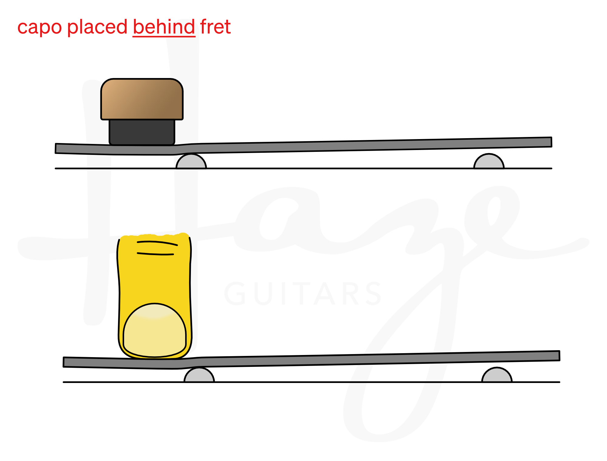 Honestly. People keep asking me about this. During setup—when we often capo at the first fret to check relief and action—should the capo be placed on the fret or behind the fret? I get a lot of emails about it, largely I suspect, because there are plenty of videos and articles like this one where the reader is admonished to place the capo “on top of—not behind—the 1st fret”. So people email and ask me my opinion as a capo thought-leader. 😄