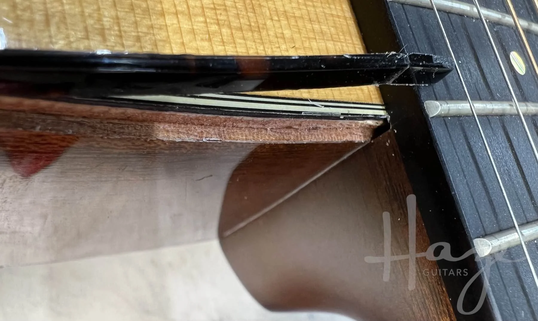 Shrunken bindings often cause gaps at the internal curve of the guitar waist. Last week we looked at the annoying process of working shrunken binding free from a guitar body to provide a little extra slack at the waist. We pulled this slack back and glued the binding back in place, leaving a little gap at the start/end point which we filled with a new piece of binding grafted in.
