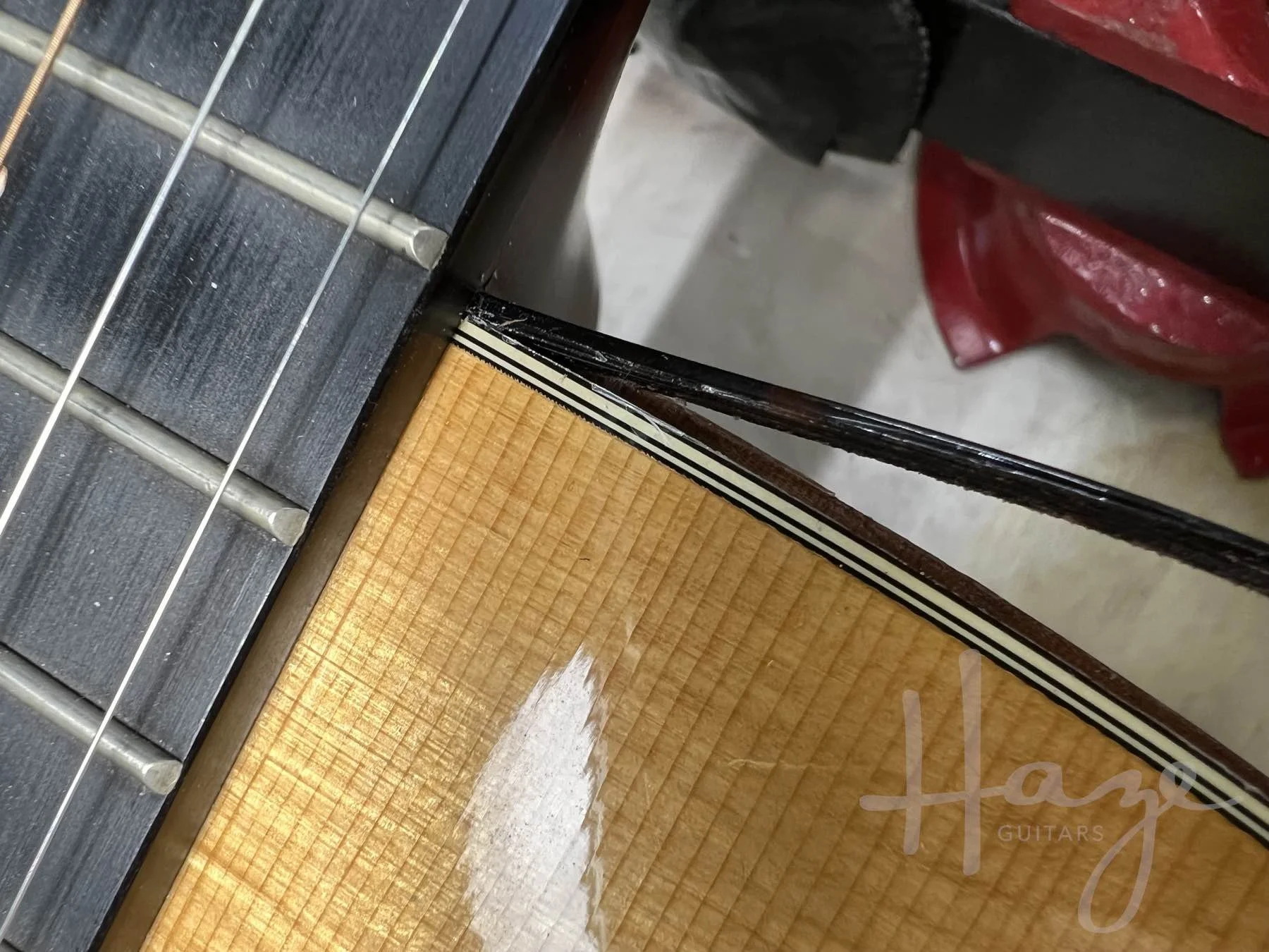 At this point, you’re back to cleaning the binding channels and the back/bottom of the binding to remove glue residue. Then glue it all back again. When you get back around the neck area, it should be relatively straightforward to push the free ends back into their slots for a nice clean job.