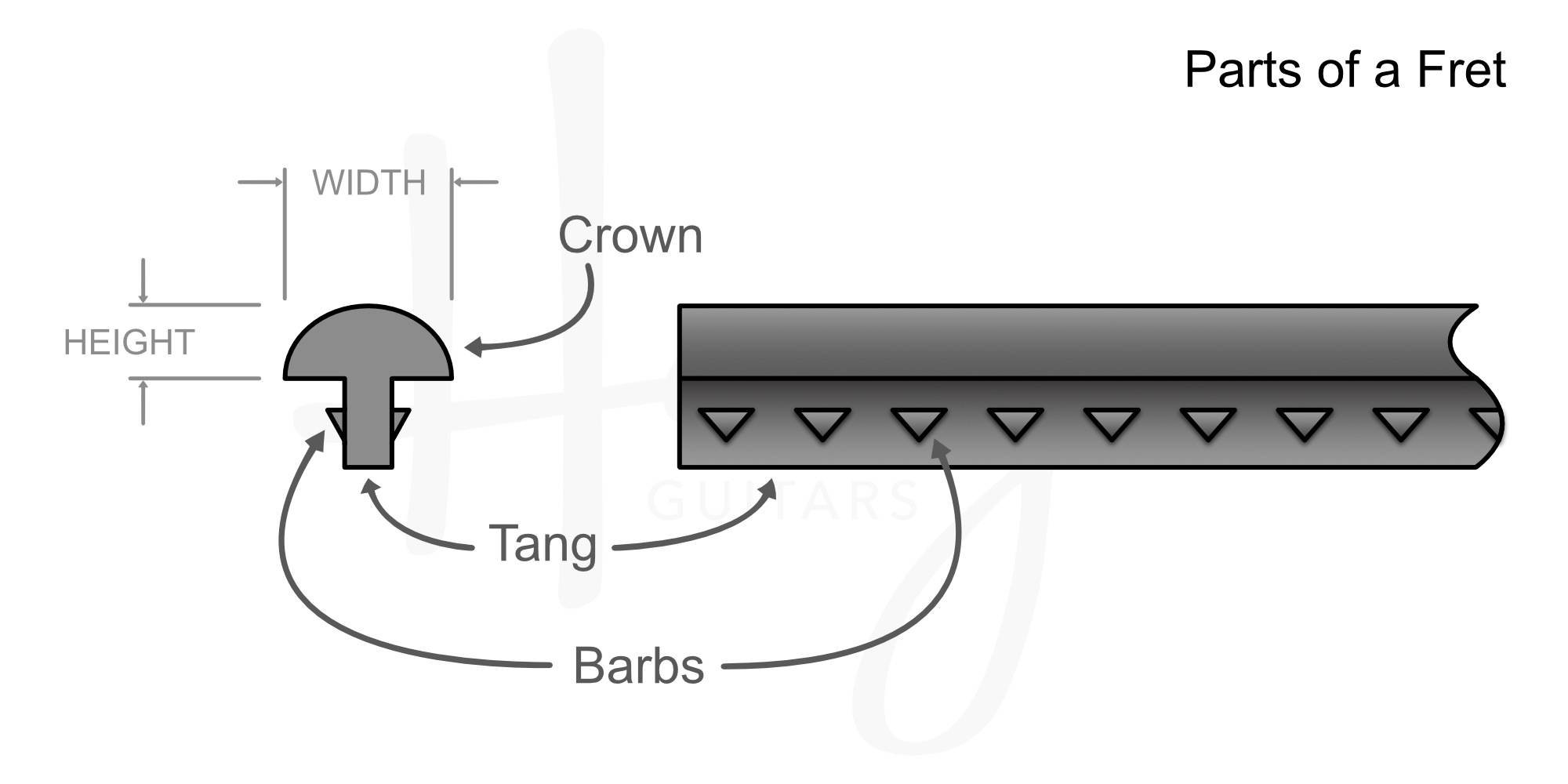 Modern fret wire has a crown and a tang. The crown is the part you see sticking out of the fretboard on your guitar—the part the strings contact when you play—and the tang is the part inserted into slots in the fingerboard. To help the frets stay put, the tang generally has a series of barbs along its sides. So, the idea is that you’ll cut slots in the fingerboard that are the same width or just a tiny amount wider than the tang (a couple of thousandths of an inch) and the barbs will grip the sides of the slot as the fret is inserted. Because of the close tolerances, the fret is usually pressed or hammered into the slot. The tang mostly fills the slot and the barbs keep the fret in place. So far, so regular-fretting.